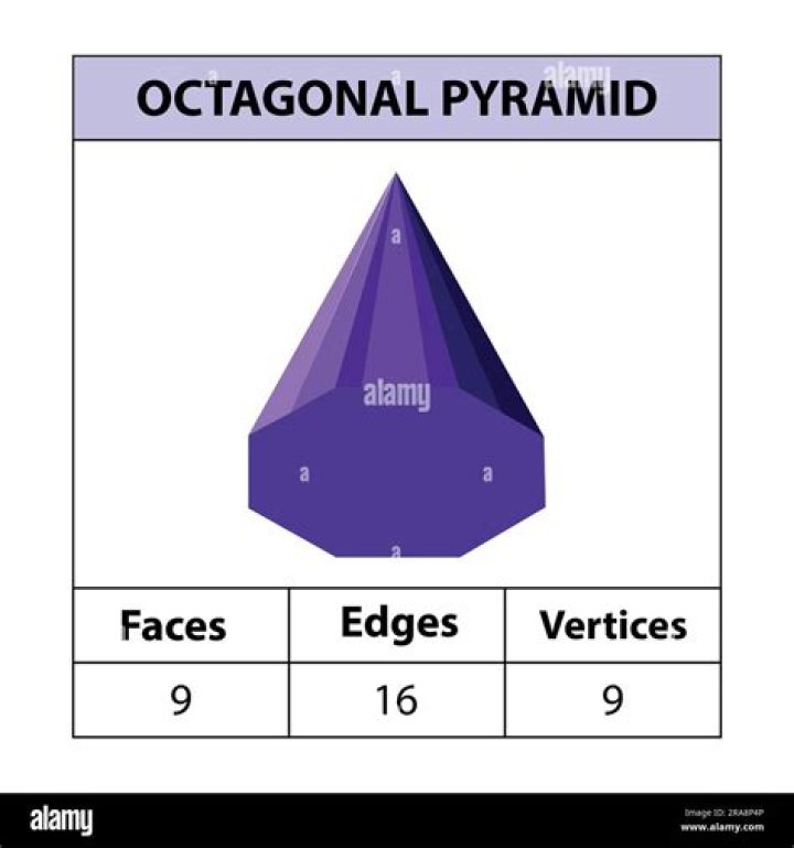 An octagonal pyramid has nine faces: eight are triangular faces and one face is a regular octagon. It also has 23 edges and nine vertices. The topmost corner that connects all the faces is called the apex. Any pyramid whose regular polygonal base has n sides will have n+1 faces, 2n edges and n+1 vertex.