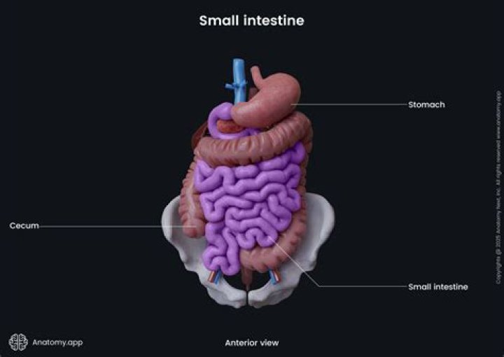The small intestine, which is directly connected to the stomach, is 3 to 5 meters long end-to-end. It is made up of three sections known as the duodenum, jejunum and ileum. The inside wall of the small intestine has folds in it, like the body of an accordion.