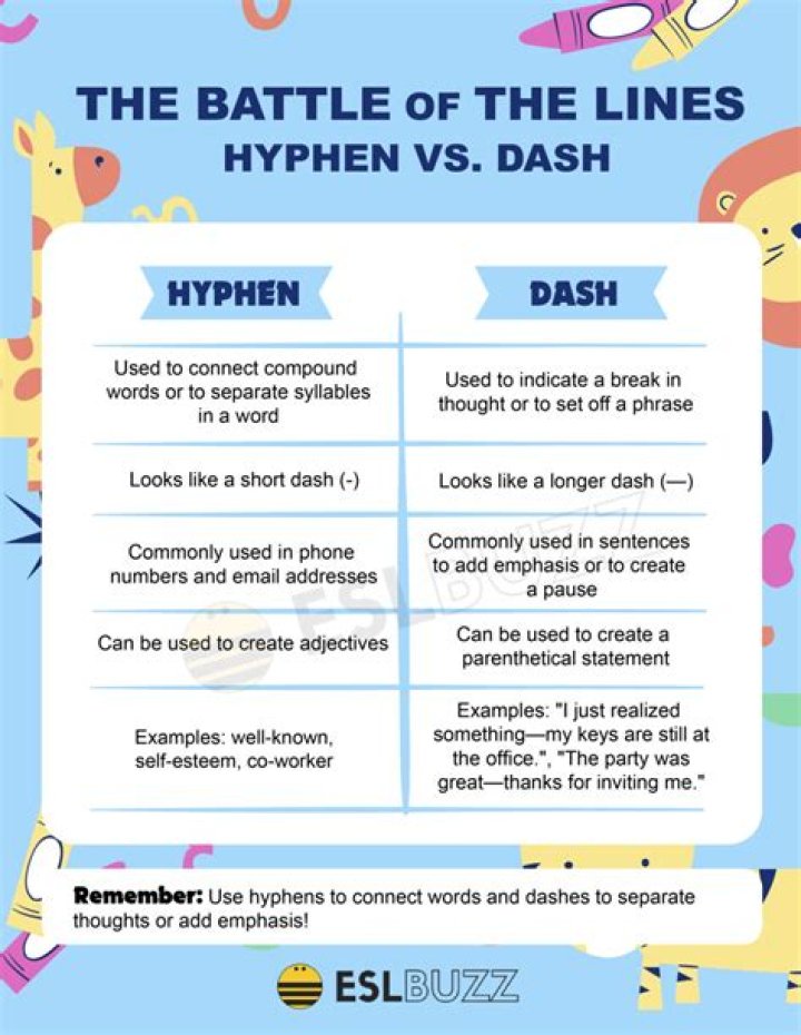 A hyphen (-) is a punctuation mark that's used to join words or parts of words. It's not interchangeable with other types of dashes. A dash is longer than a hyphen and is commonly used to indicate a range or a pause. The most common types of dashes are the en dash (–) and the em dash (—).