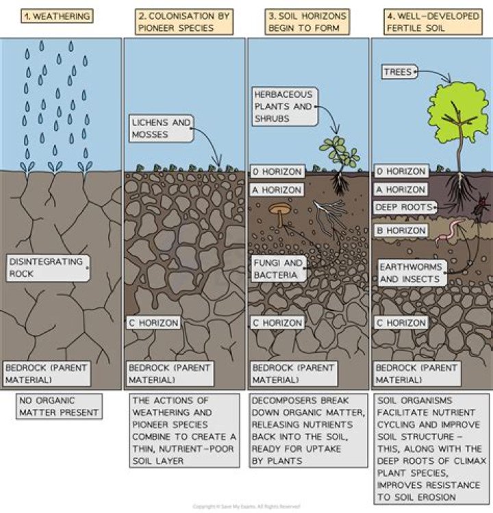Soil is formed by weathering of rocks. Weathering is the breakdown of rocks by the action of air, wind and water. ... Rock is broken down into small particles. These small particles mix with humus (organic matter) and form soil.