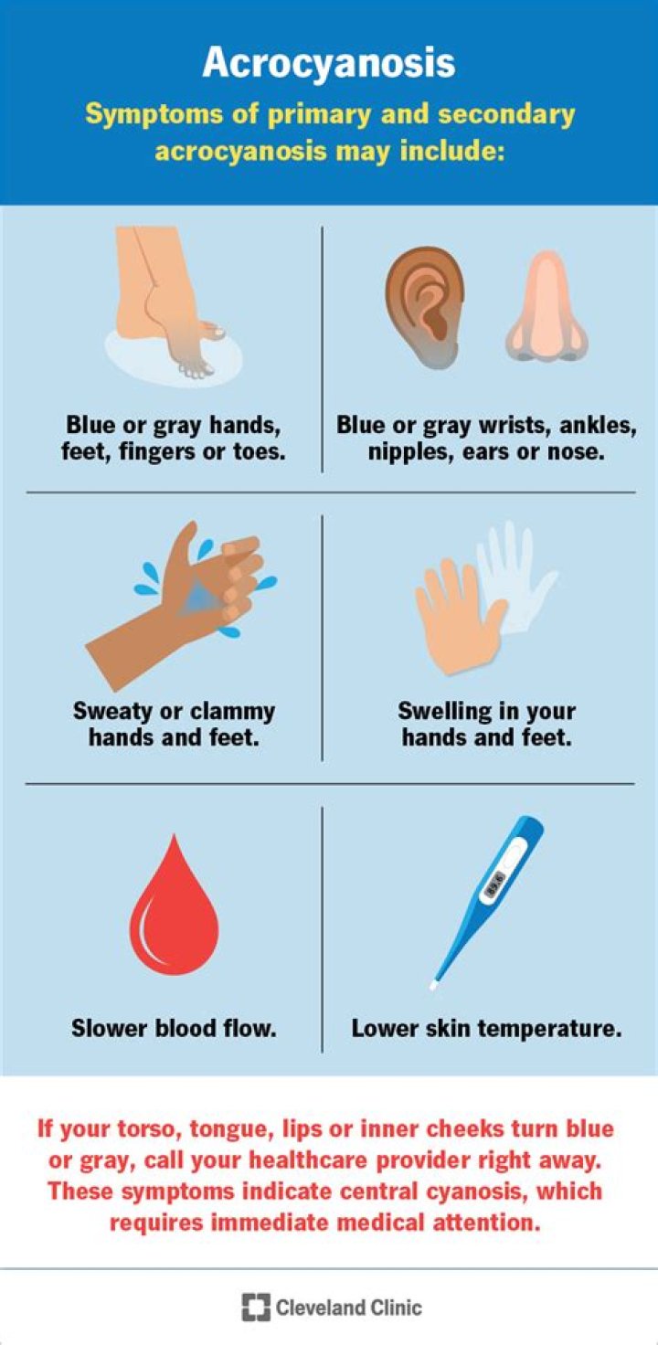 Peripheral cyanosis is when the hands, fingertips, or feet turn blue because they are not getting enough oxygen-rich blood. Cold temperatures, circulation problems, and tight jewelry are common causes of peripheral cyanosis.
