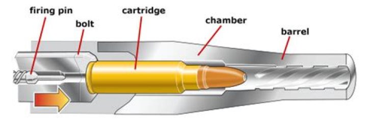 The firing pin strikes the primer, causing it to explode. The spark from the primer ignites the gunpowder. Gas converted from the burning powder rapidly expands in the cartridge. The expanding gas forces the bullet out of the cartridge and down the barrel with great speed.