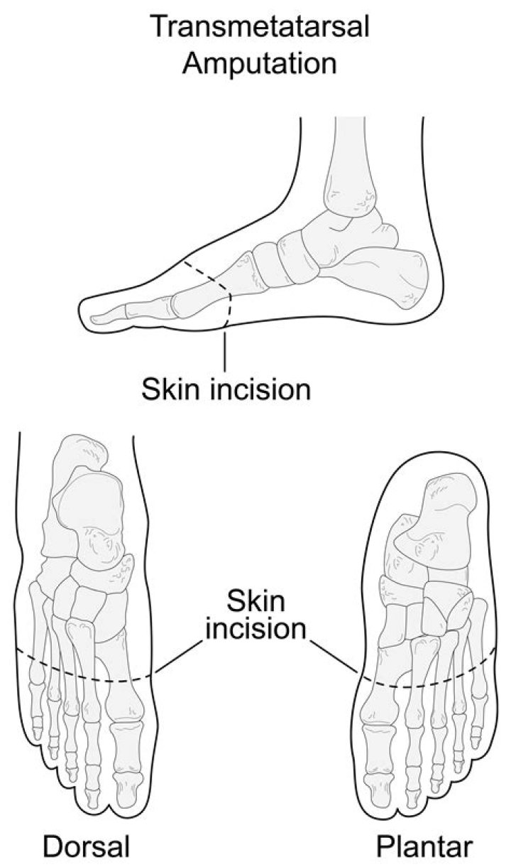 The first step in a transmetatarsal amputation (TMA) is to make a curved fish-mouth incision just proximal to the infected tissue of the foot (see the image below). The incision runs from the midshaft of the fifth metatarsal laterally to the midshaft of the first metatarsal medially through a midplane axis.