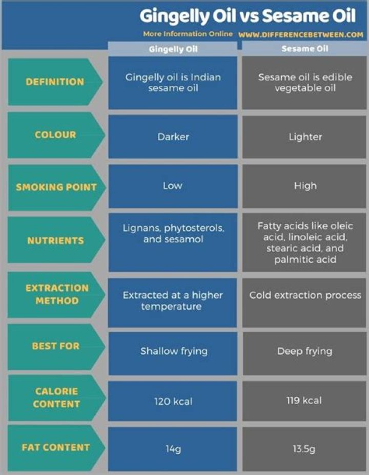 Sesame and Gingelly oil both are from the same parent seed, the difference is in the processing of the seed before extraction of these oils. ... Third variation from the seeds is where the sesame seed is roasted and then oil is extracted from it, yielding a dark brown color.