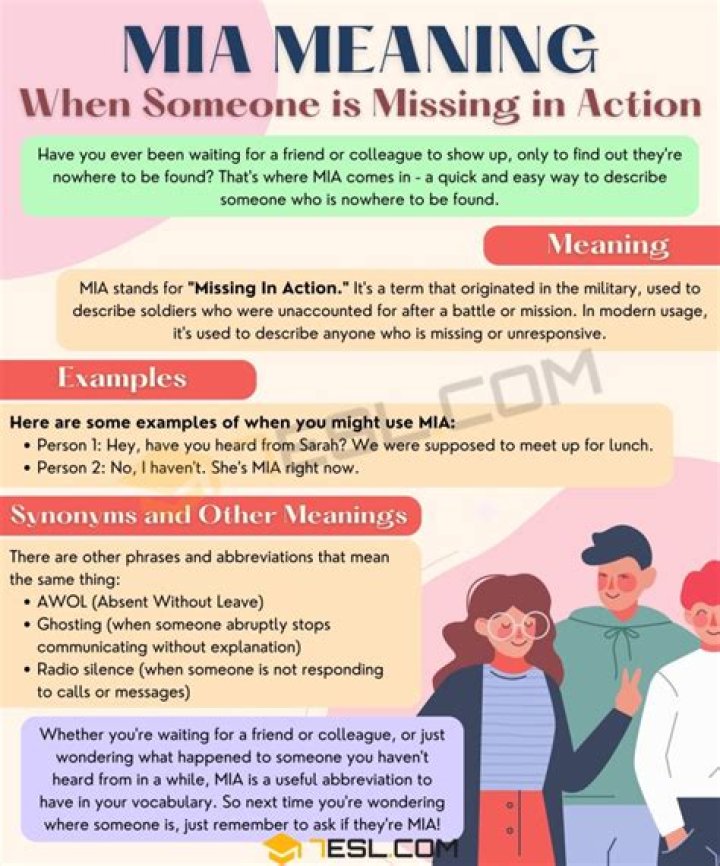 abbreviation for missing in action: used for saying that a member of the armed forces has not returned from fighting in a war but is not known for certain to be dead : High numbers of military were still listed as MIA.