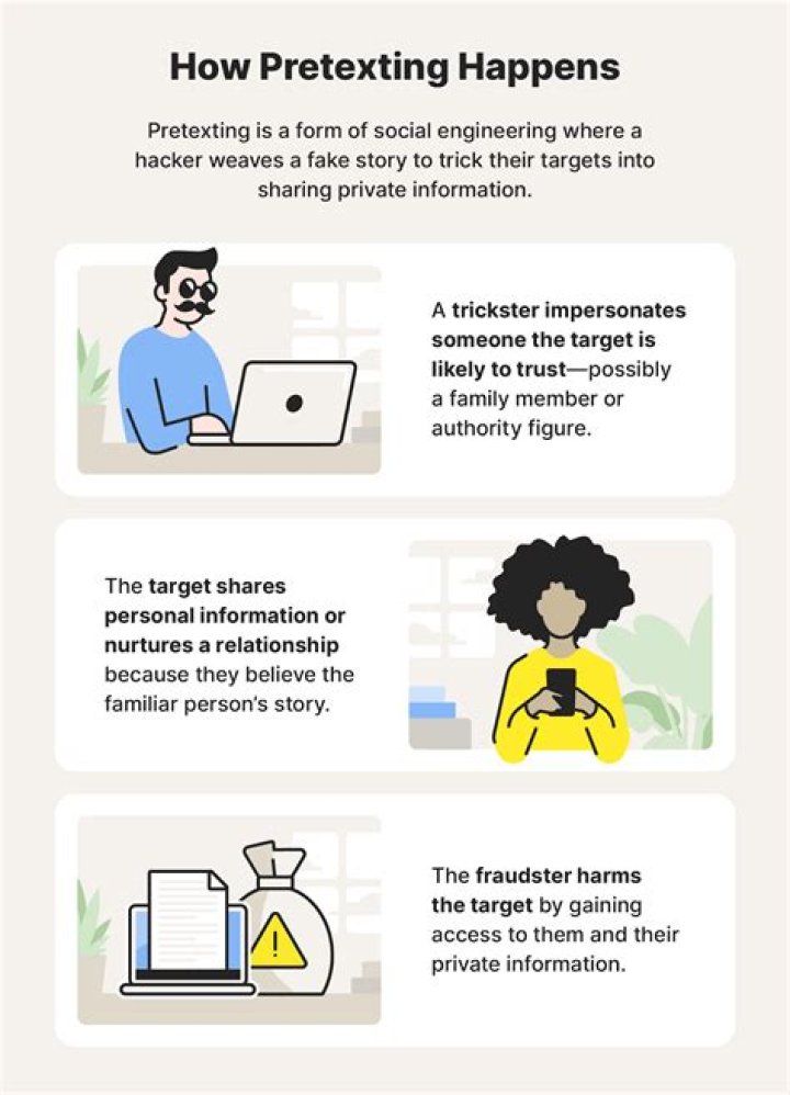 Pretexting is a method of inventing a scenario to convince victims to divulge information they should not divulge. ... Often, these alternate methods involve requesting verification of personal information, such as residence, date of birth, mother's maiden name, or account number.
