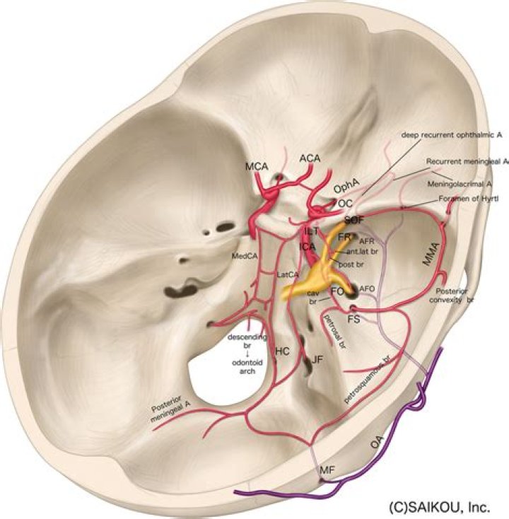It then courses forward through the dura mater, the outermost layer of the meninges, via a groove on the great wing of the sphenoid bone, a bone on either side of the cranium.