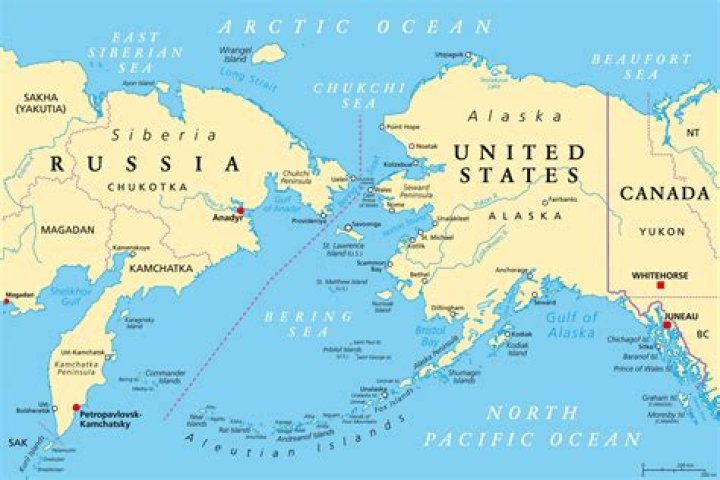 Yes. Russia and Alaska are divided by the Bering Strait, which is about 55 miles at its narrowest point. In the middle of the Bering Strait are two small, sparsely populated islands: Big Diomede, which sits in Russian territory, and Little Diomede, which is part of the United States.
