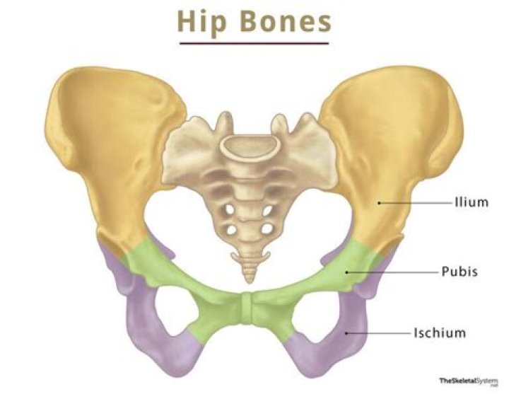 The adult os coxae, or hip bone, is formed by the fusion of the ilium, the ischium, and the pubis, which occurs by the end of the teenage years. The 2 hip bones form the bony pelvis, along with the sacrum and the coccyx, and are united anteriorly by the pubic symphysis.