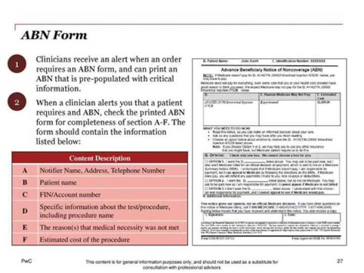 The Advance Beneficiary Notice of Noncoverage (ABN), Form CMS-R-131, is issued by providers (including independent laboratories, home health agencies, and hospices), physicians, practitioners, and suppliers to Original Medicare (fee for service - FFS) beneficiaries in situations where Medicare payment is expected to be ...